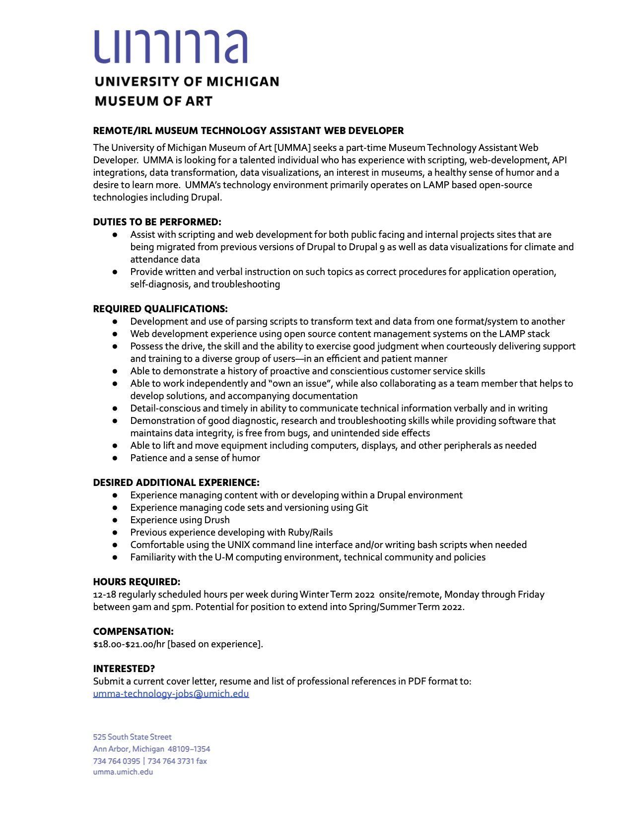 Michigan Institute For Data Science Midas On Twitter The Museum Of Art Is Hiring For A Part Time Assistant Web Developer For The Winter Term 2022 If Interested Submit A Current Cover Letter